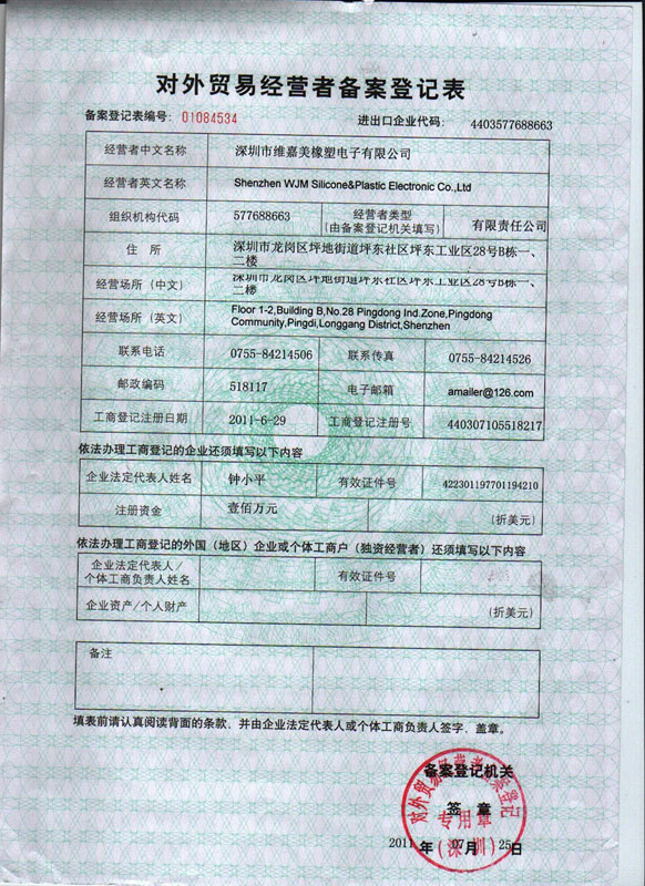 имеет право на самостоятельное осуществление экспортно-импортных операций Номер регистрационной анкеты участника внешнеторговой деятельности: 01084534 Името на компания за износ: Shenzhen Wjm Silicone & Plastic Electronic Co., Ltd. Лиценз Фото: